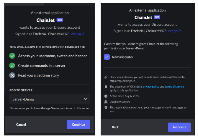 After selecting Discord Integration, you have to click on Connect Discord account and choose a server. Click on continue, grant the ChainJet bot the required permissions, and authorize it.